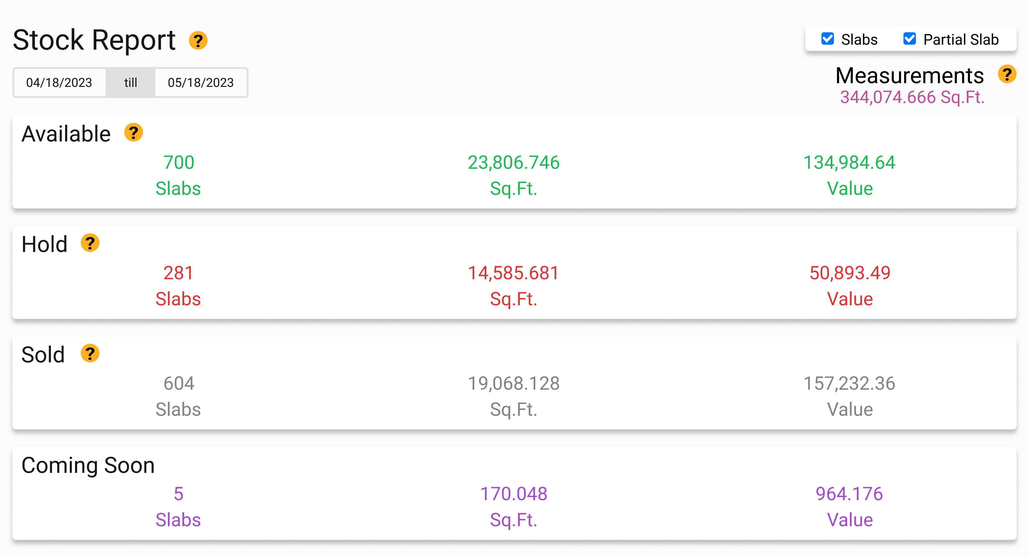 There’s also the Stock Report, where you can check the quantity, the total SQFT, and the total value of slabs available, on hold, sold, and the ones expected to arrive soon within the specific period you set.